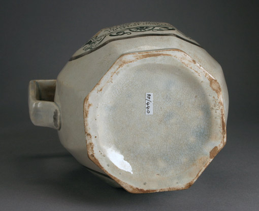 Poorly applied text transfer print in graphite ink, not silver lustre. The blue cast that gives this ware the "pearlware" name is very clear on the bottom. The earthenware fabric is also visible where the glaze is worn on the base.