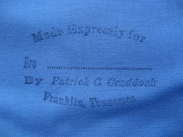I sign and number each of my aprons. This one happens to be No. 32. There is also a stamp on the back were a Brother could affix his name to this apron. (see photos)