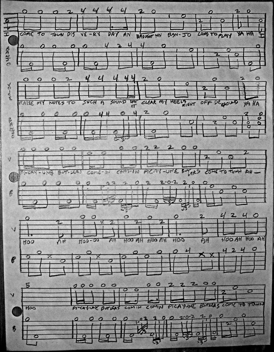 Here are 2 tablature's from Phil. Rice's 1858 Correct Method for the Banjo. Picayune Butler has the melody and words on the top staff, and the banjo part underneath it. It took me months to get the singing and playing down together, but it's worth it. If one of your comrade's like's to sing, you might teach him this song and just play behind him.