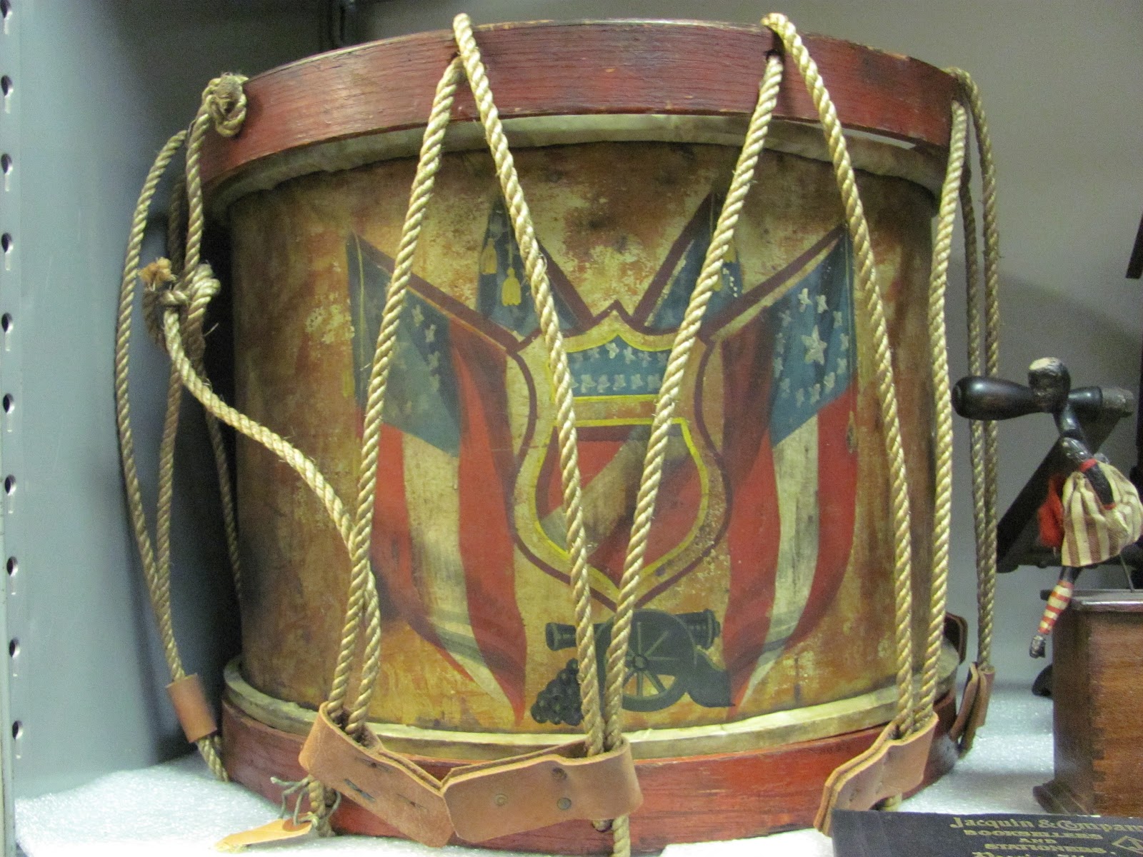 Confederate artillery drum. It was captured at Island No. 10 on the Mississippi River and was given to Captain Henry Detweiller of the USS Jenny Lind by a sick Sioldier for his kindness to him while being transported on board.