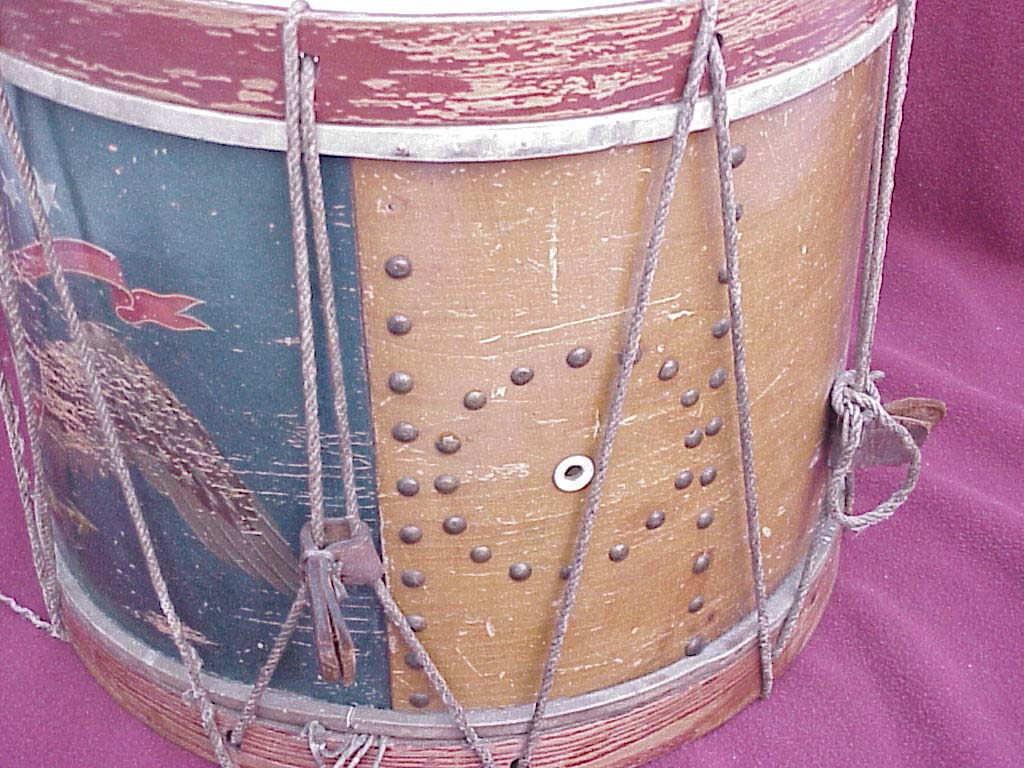 I have also included a picture of a drum without a snare strainer. As you can see, the guts are simply hanging out from between the bottom head and counter hoops. You can also see that there are not many strands of gut either. Having many strands of gut is more of a modern mindset.