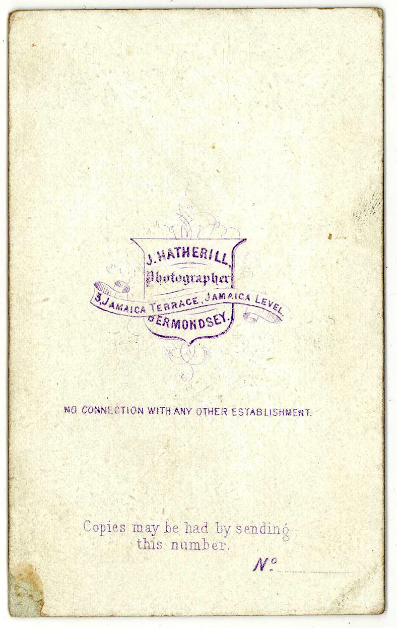 Judging from information contained in "A Directory of London Photographers 1841-1908," the location stated for Mr. John Hatherill's gallery on the back of the image indicates he "traded" there c.1869-1876. Hatherill apparently had a long career as a photographer: 46 years (1862 until at least 1908) and operated at several locations in South London.