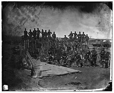 Pretty well known image and full of quirky details. NYS jackets, lots of boots, a visor-less forage cap, dark blue trousers, lots of kepis, 1842's & weird accoutrement belts. What are the two mini cartridge boxes attached to the front of their belts?