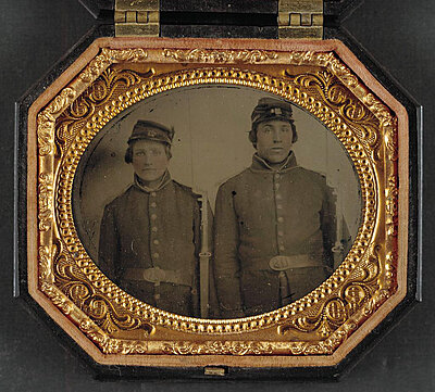 This is labelled as a tintype at the LOC http://www.loc.gov/pictures/item/2010650271/ and it certainly looks like one, but it's not reversed. The, ahem, young man on the left has a belt buckle that reads the right way, and their coats both overlap correctly. The belt buckle of the man on the right has been drawn in reversed, for some reason, although the actual buckle is not reversed.