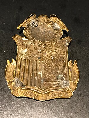 I am not a specialist in the civil war. I came across a few shako badges recently at an estate in Connecticut. A couple of them were very easy to identify but I'm having a hard time with this one. It has Excelsior and the New York state seal on it but the regiment number is at the top (vs. the middle like other regiment shako badges I've found) and the eagle is a lot smaller with a laurel wreath around the regiment number. I've included a couple of photos of the front and back. It is stamped brass and measures roughly 3.25" high by 2.25" at the base.
