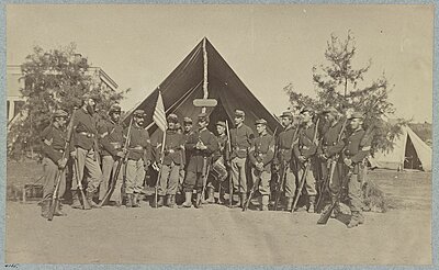 I've been researching the 22nd NYNG through written accounts and photographs for a while now. Yesterday I found the top photo and a few things jumped out at me. While most of the photos show soldiers armed with P56 rifles or perhaps commercial variants thereof, the soldiers in the photo below appear to have carbines. I found the photo of the corporal with the rifle-musket a year ago and thought it was just a one off. The LOC photos are full of wonderful details and you can see a nice subtle variety in arms, clothing, and accoutrements.