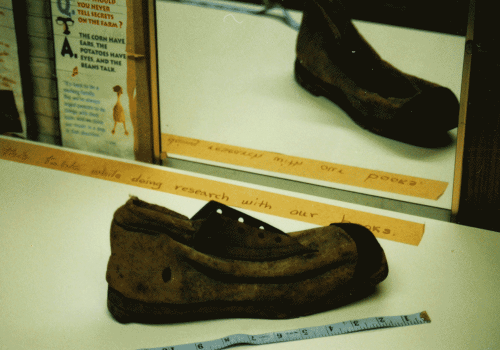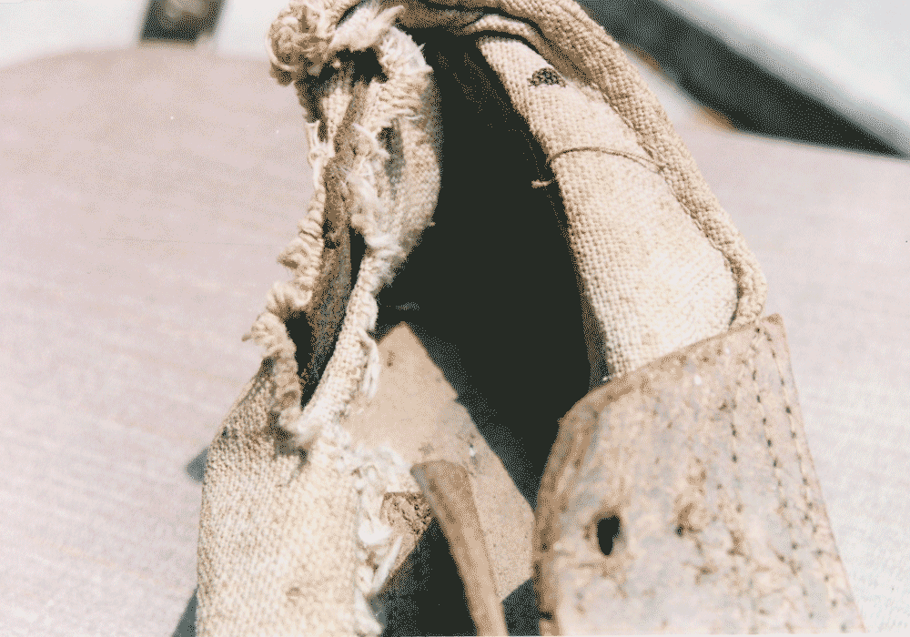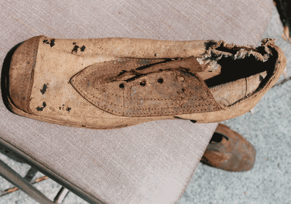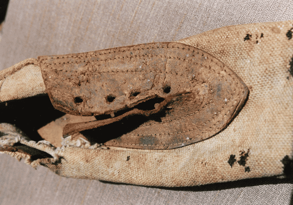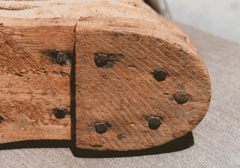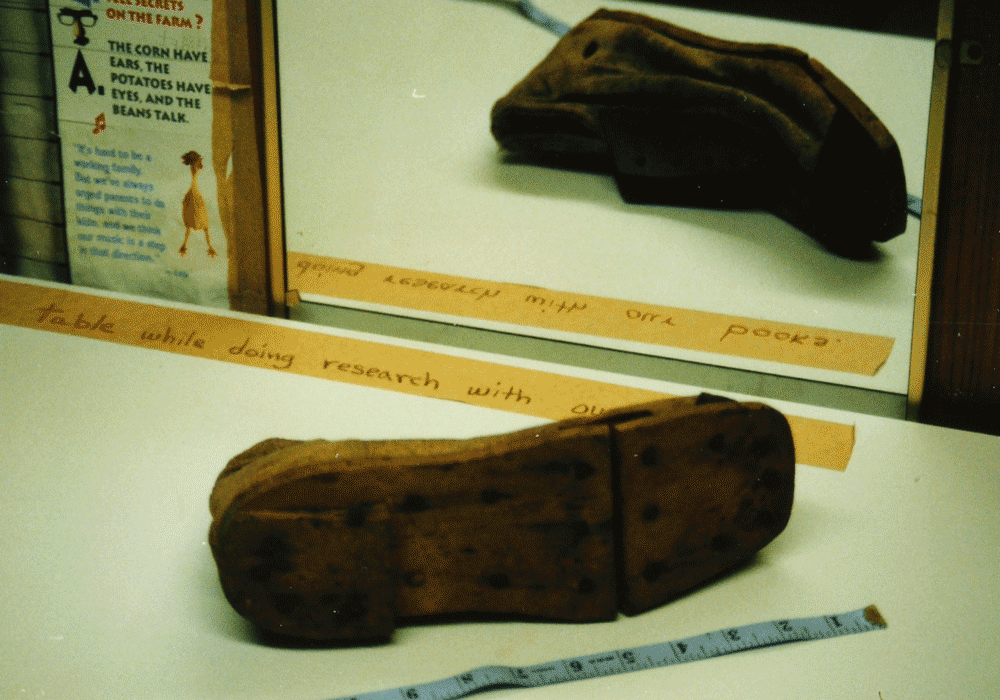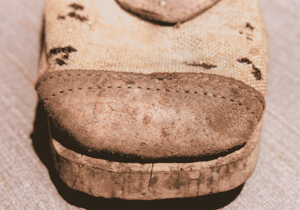 CS hinged wooden sole canvas shoe - unique construction with leather under break in sole to provide a "hinge" mechanism. Possible Charleston Depot origins. Collection owner wishes to remain anonymous.