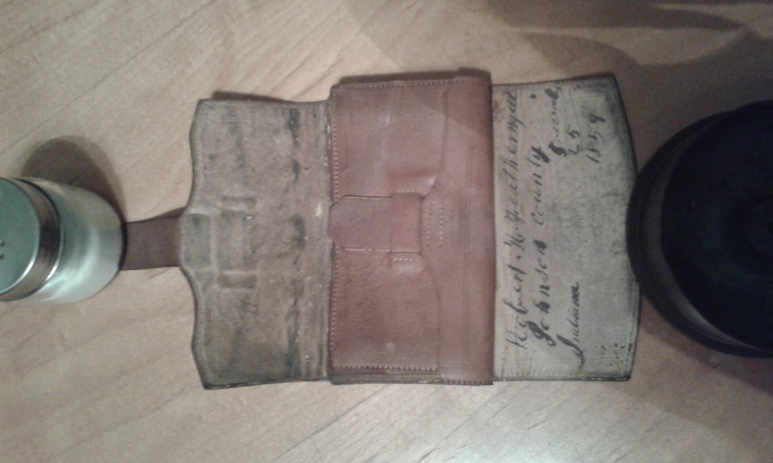 I was going through some items I plan to donate to local museum/University and came across this wallet. It is dated Dec 25, 1859. Amazingly the leather is still very subtle, it could be used without fear of it being damaged.