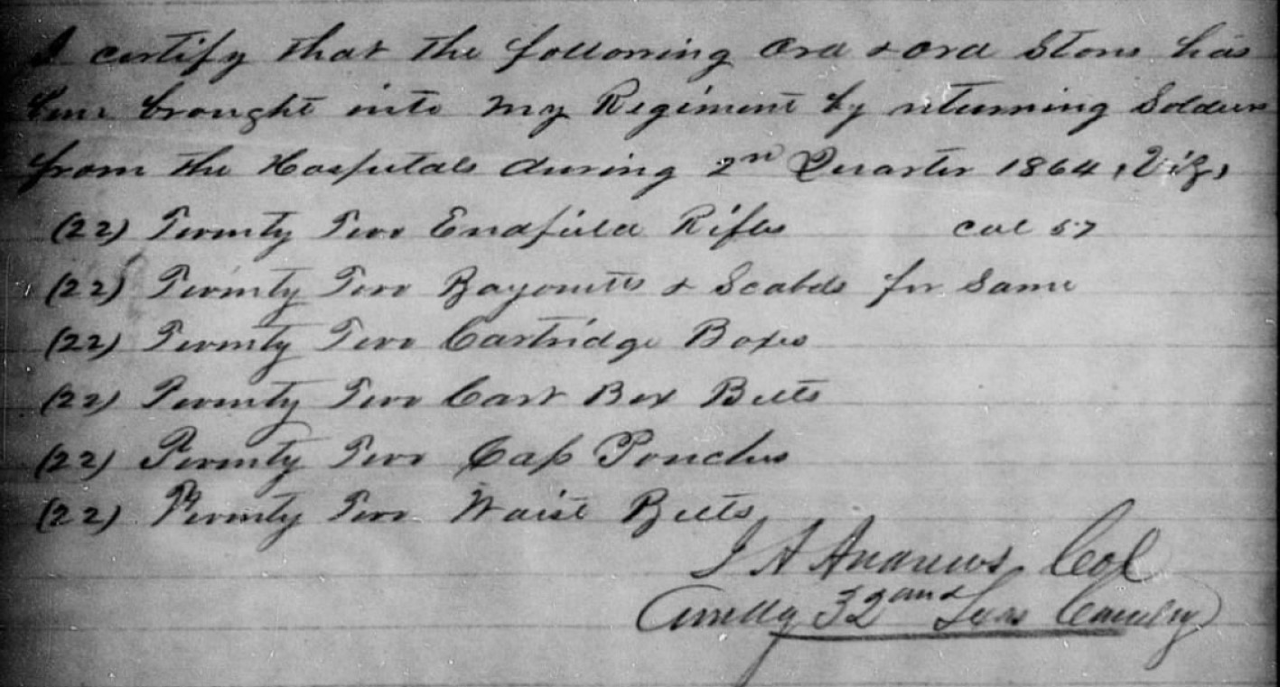 I knew soldiers were generally issued new clothing leaving hospitals to return to their units. What I was not sure of was whether they were re-armed prior to returning to their field units. Attached is ordnance receipt of the regimental commander for the arms and accouterments for 22 soldiers returning to the 32d Texas Dismounted Cavalry Regiment (Ector's Infantry Brigade) for 3 months during the height of the Atlanta Campaign.