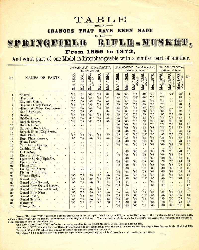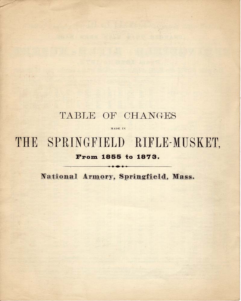 I was cleaning out the library and stumbled across this pamphlet. Thought it may be of use to some of you, or at least a nice reference to keep on hand. It's titled Table of Changes Made in the Springfield Rifle-Musket, From 1855 to 1873. and is from the National Armory in Springfield, Mass. As listed on the inside it is a "table showing changes that have been made in the Springfield rifle-musket, from 1855 to 1873, and what part of one model is interchangeable with a similar part of another."