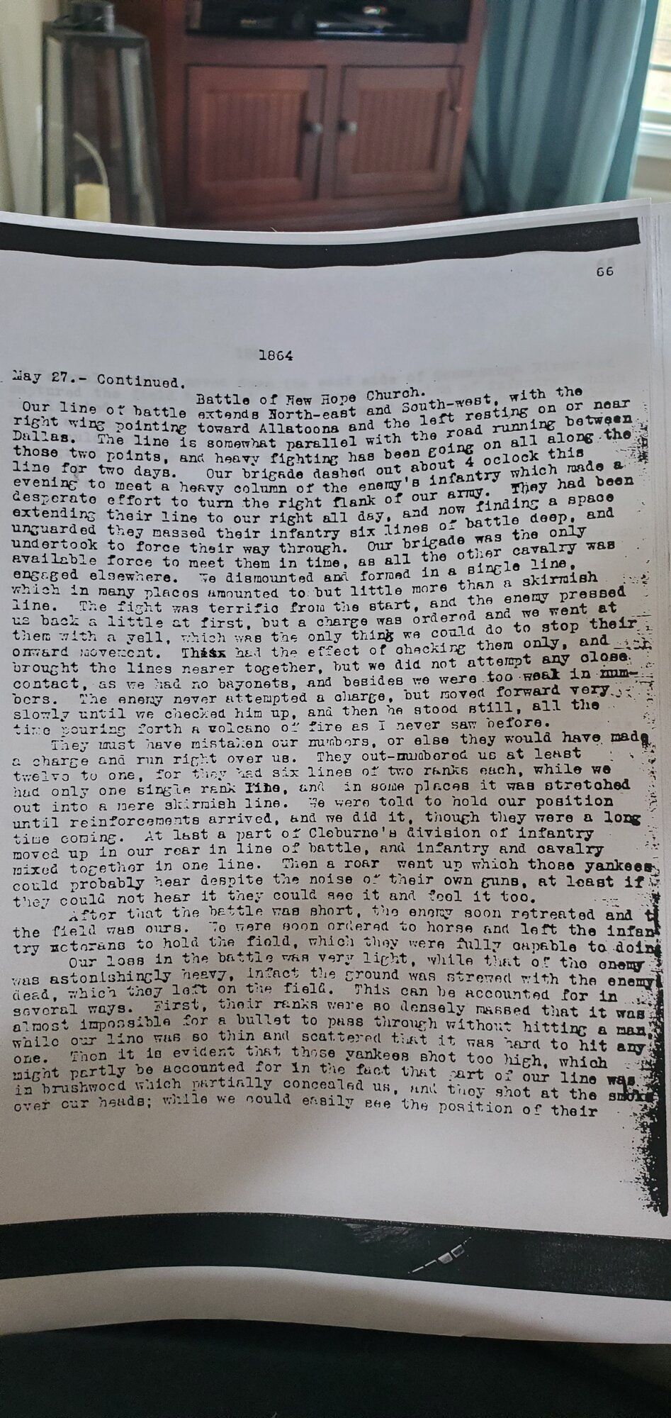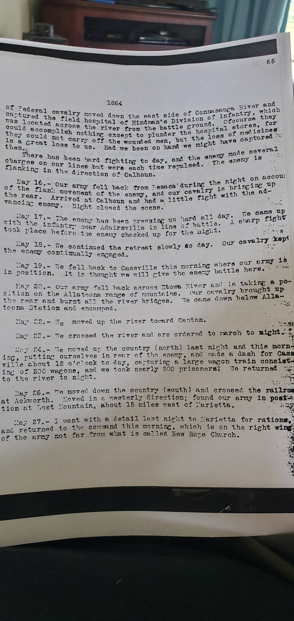 The following are a series of diary entries and a letter home by T. H. Williams of the Confederate 1st Tennessee Cavalry(Wheeler’s), Ashby’s Brigade of Hume’s Division, as he processed through shock, fatigue and grief following the Battle of Pickett’s Mill. Fighting dismounted to the right of Granbury’s line, Ashby’s Tennessee Cavalry Brigade fought desperately to keep the Confederate Right from collapsing in on Granbury’s Texans. Not only did these Cavalrymen face a heavy fire from their fro