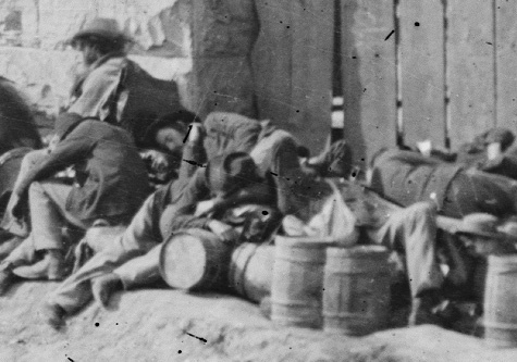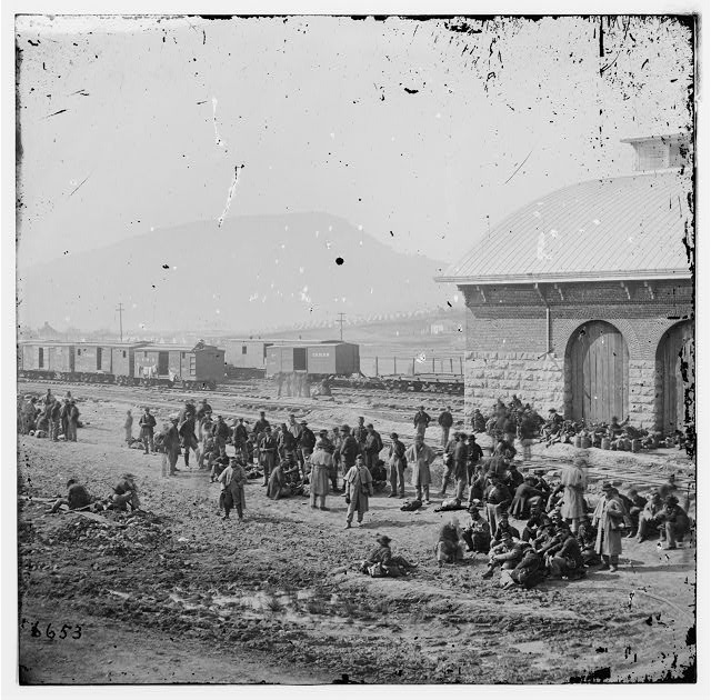 Here is a picture of what I believe are Federal soldiers wearing white haversacks. The original caption on the photo says that they are CS prisoners "Confederate prisoners waiting at Chattanooga to be sent north."