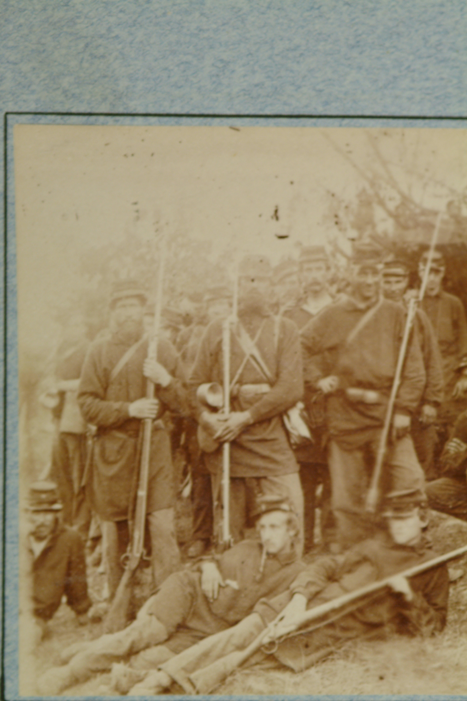 I came across these images of 2nd Rhode Islanders in our archives this morning. The first image shows what I believe is a hatchet in a carrier hanging from a belt on the man standing at the left. The second image clearly shows a hatchet inside the belt of the man also standing at left. These I believe were taken outside D.C. in the summer of 1861. I apologize for the poor photography by myself.