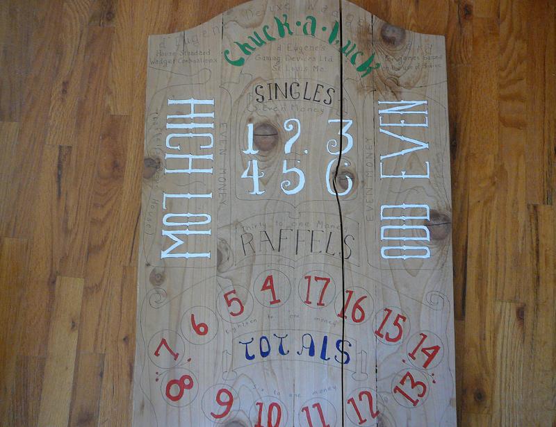 The simplest version of Chuck-a-luck is a fair 50-50 game. But these boards give a 7% advantage to the house because all raffels (all dice the same) go to the house. The simplest version just has six numbered squares. As you can see, these boards have lots of additional options that make the game much more interesting.