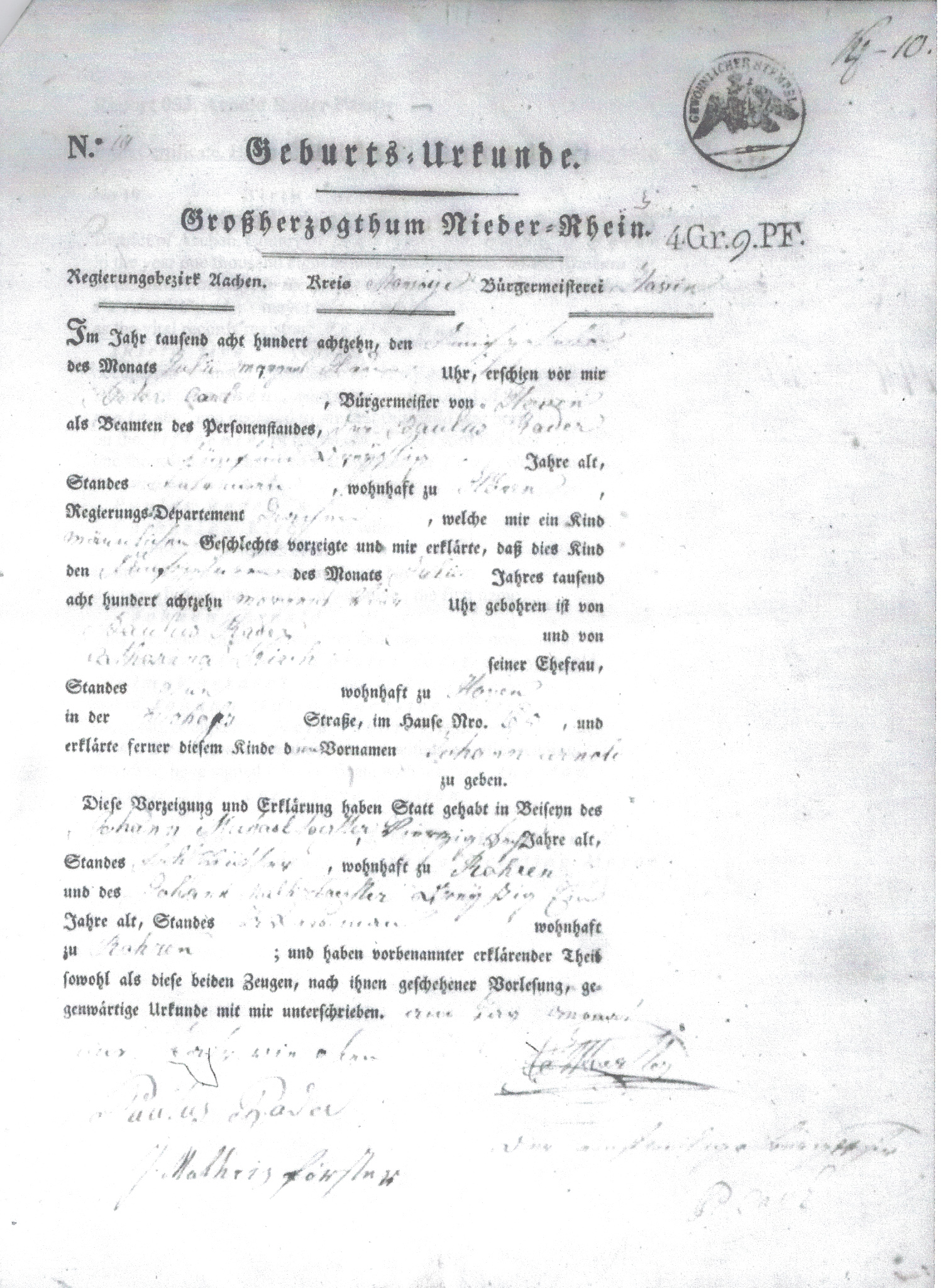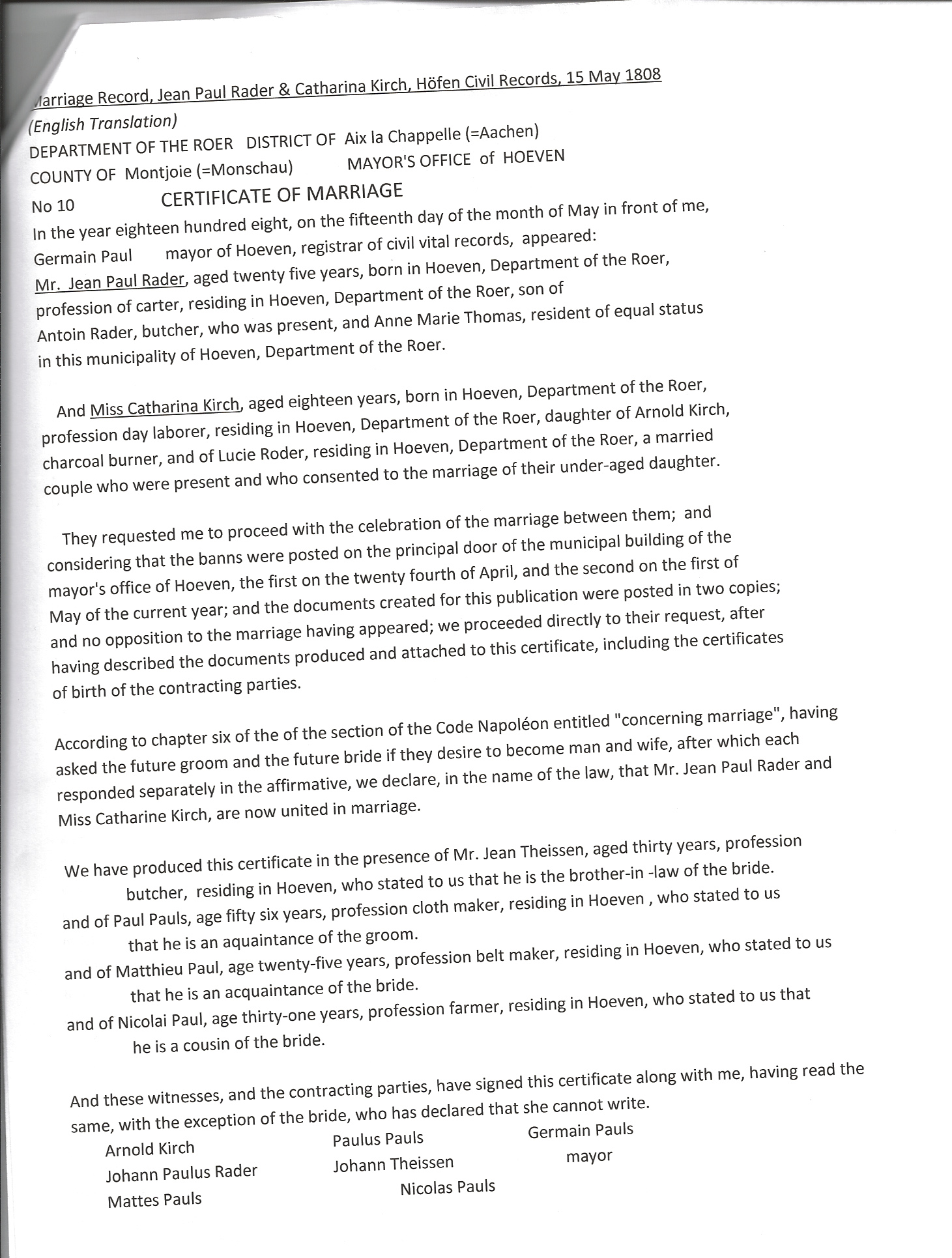 One problem as mentioned above, is being able to read and write high and low German. This is probably the hardest thing I have ever did in geneology. To find my great grandfather's linneage, I had to go back to both the Church and Civil Records in Hofen, Germany. Then translate them to English. These are My great grandfather' birth records Arnold Rader) from Hofen, Germany in 1815 and also, included is the marrage of his parents (my great great grandparents) from Hofen, Germany first the Original Marriage Certificate (in German) and my translation to English. John Paul Rader and Catharina Kirch May 15, 1808.