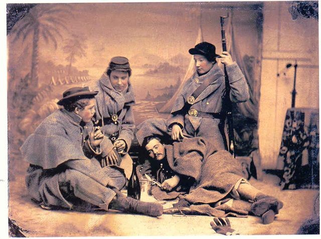 Heres a few pictures of soldiers wearing forage caps. I think they themselves can succesfully debunk the baseball cap thing. Notice in the first picture they are wearing, as Mr. Daley stated, very tilted back. Same with the next picture, you get the feeling they are wearing their caps very high. The man with the forage cap in the third picture wears his fairly low, but i suspect these men were trying to recreate (in a CDV) a winter camp so he would try to stay warm. The fourth picture as well the men are wearing their caps high.