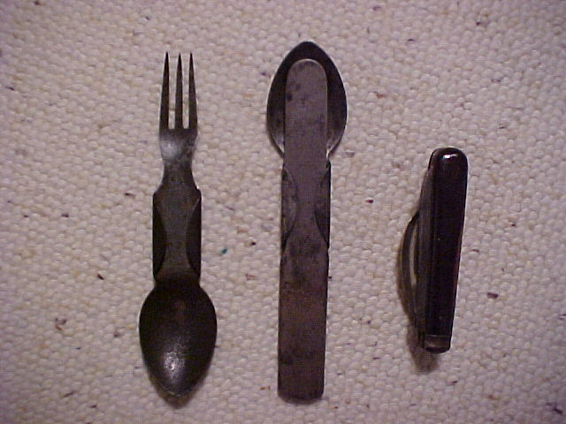 I've attached a photo of two of the most commonly seen original styles. The "spork" (a modern term -- hold yer fire) on the left is a partial set that came out of an original haversack. The set in the middle is the same thing with both of its parts. They are made from some ferrous material. The one on the right is a common specimen of the folding variety with a german silver or plated brass spoon on it.