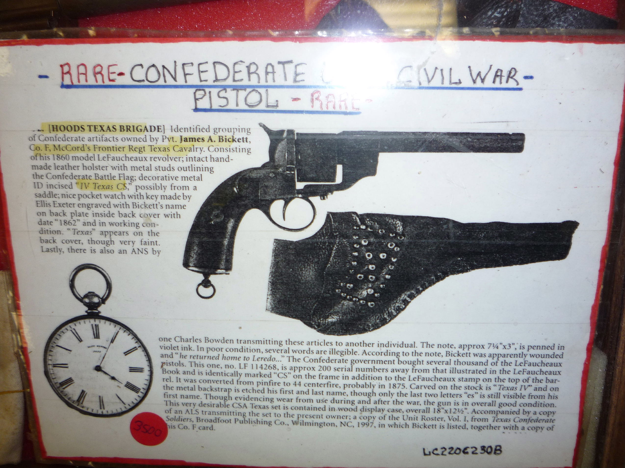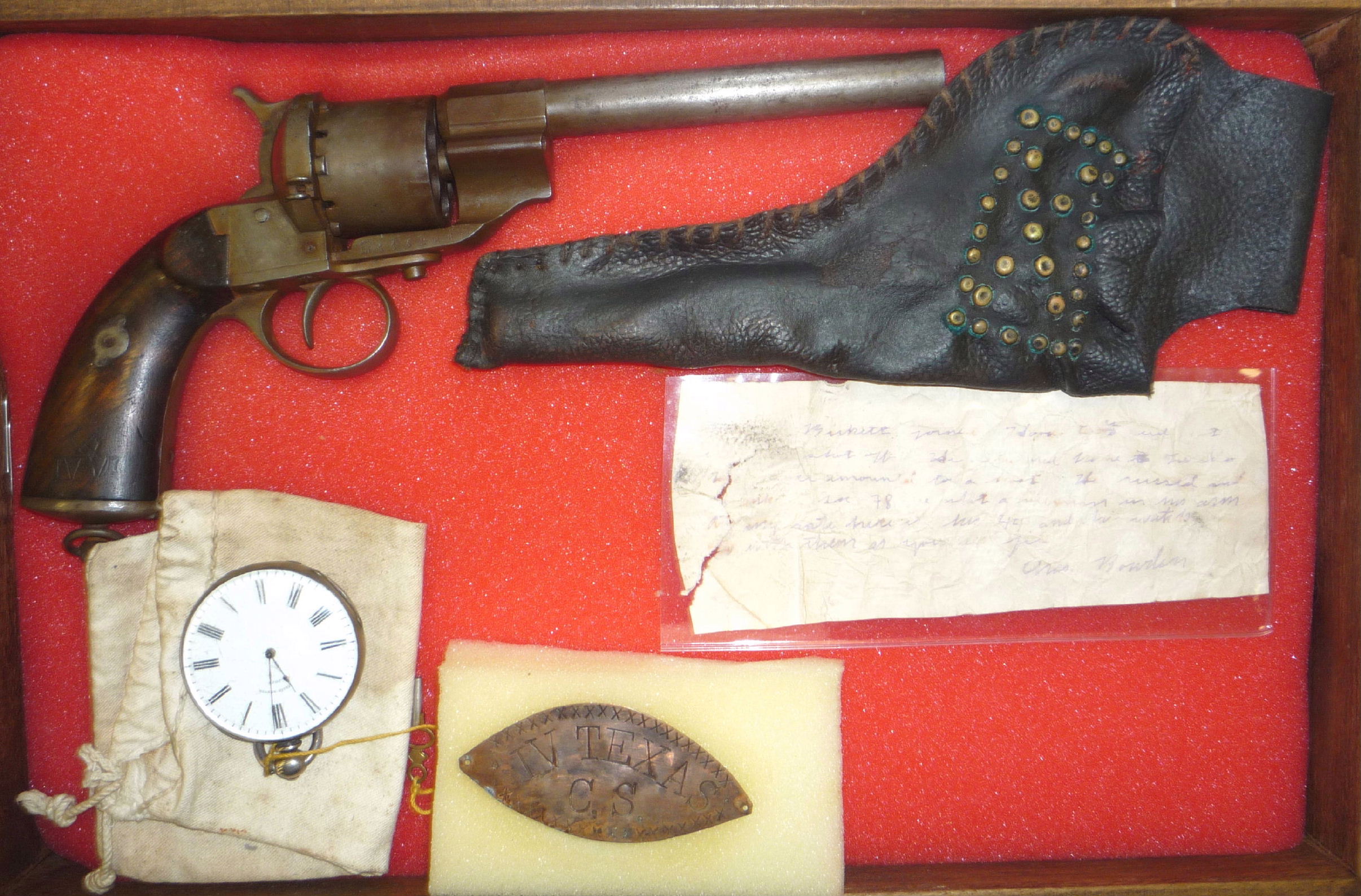 1. & 2. A nice pin fire pistol, holster etc. from a member of the 4th Texas Cavalry. The description tells the tale on this one.