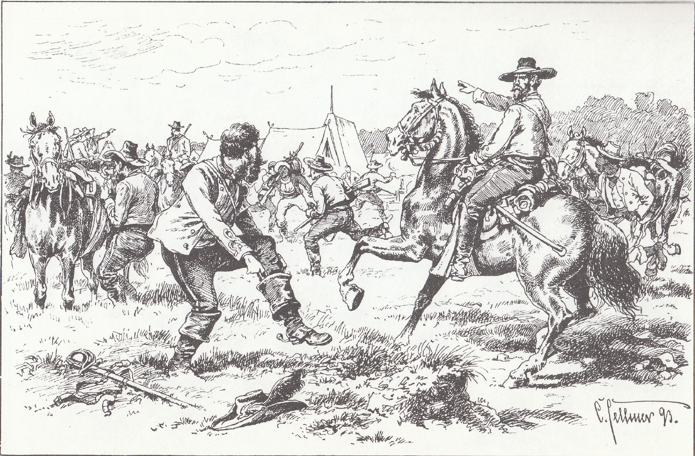 The cavalryman carried a slightly curved sabre which, as a rule, was fastened under the upper saddle girth below the soldier’s left leg (Ed.: OH, Oh! Not this again! More contemporary evidence!), a revolver (Colt) in a holster fastened to his sword belt, and a rather long carbine slung over his back.
