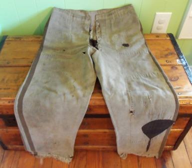 The uniform pants are the only known (that I am aware of) pair of quasi-official State of Mississippi issue trousers. The state of Miss. regs authorized a uniform that was widely adopted although fudged a bit in many quarters. These trousers are an example. Apparently William Morris, Co. D, 38th Miss Inf., was issued these early in the war. Wore them at the battle of Shiloh then the sige of Corinth but came home shortly after- never to return to the war. Although used after the war (according to the family) they survived (as did quite a bit of the family's war time and post war clothing). Its hard to see but note the double black (?) stripe down the pant leg.
