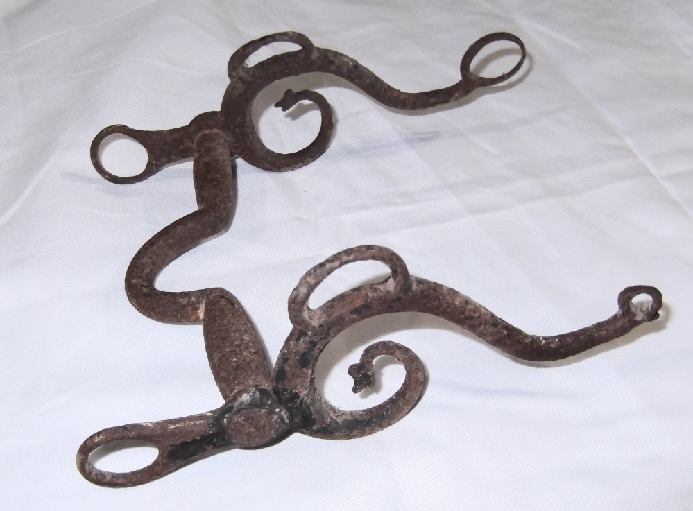 -Nice early bit which appears to be a variation of the M1841 Artillery. It differs from others I have seen in that it has no cross bar (lip/slobber bar) which is strange for an artillery bit as this bar was common and necessary to keep the reins from entangling with the bits/reins of the other horse. Perhaps it is a rare cavalry version of the M1841 or an officer's bit??? I do not know. The shape of the mouth piece bothers me some. It is not really "period" so I am not sure what to say....Never seen one like this.