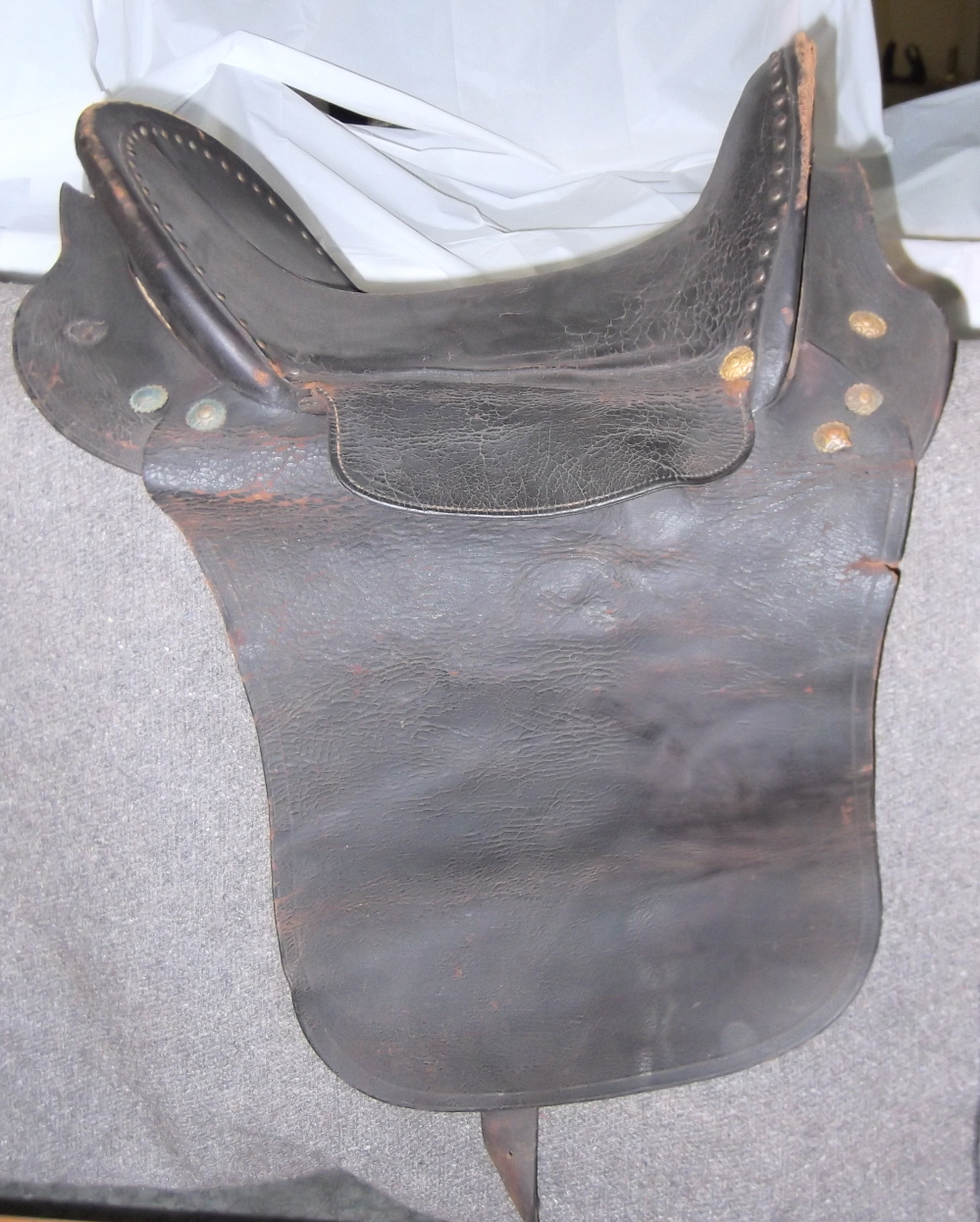 -This Texas saddle is old but not likely war time. It has some similarities to post war catalog saddles including the creased fenders, skirts, hardware, etc. but it is likely fairly early in the catalog period. The tree is quite like many catalog era including some referred to as California saddles. The stirrups are typical CW period but could be add-ons. I do not believe it is a CW era or earlier saddle but an post war commercial pattern likely 1880's or so.