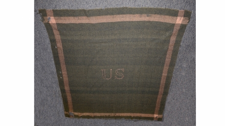 This example, (while being well used) is still intact. The center US markings are of the regulation 6” in height and are of orange yarn stitched in a serifed pattern. The horizontal and vertical orange stripes are 3” in width and measure 3”from the edges. The current length and width is 72”in length by 62” in width. Bare in mind the discrepancy of a few lost inches are due to fraying and shrinkage on both ends. While the body color had originally been a deep indigo blue, but it now exhibits a faded bluish-gray in appearance, this is the result of oxidation and many washings that this blanket underwent in its lifetime in service. The attrition rate on these blankets must have been tremendous, as they were carried folded and placed beneath the saddle and directly on the horse’s back itself. Other worn and damages areas are mostly located on the left side border with a few scattered small holes.