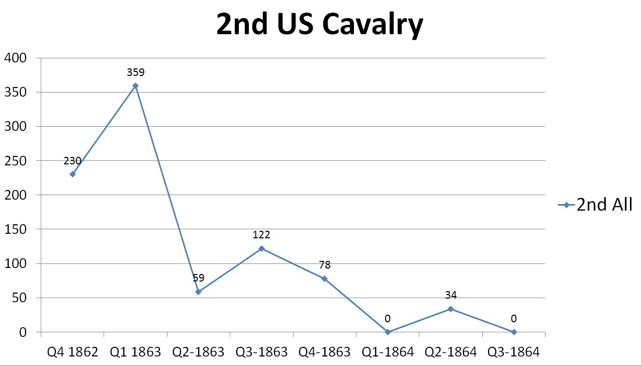 As you can see from the preceding graphs, all of the US Regular Cavalry started with large numbers of links which quickly reduced in number to near zero numbers. One exception to this rule is that the US Army conducted a large reorganization and resupply throughout 1864. And for most of the units, including the US Regular Cavalry Regiments, there was a jump of equipment numbers during this time. However, they also seem to quickly trail off again.