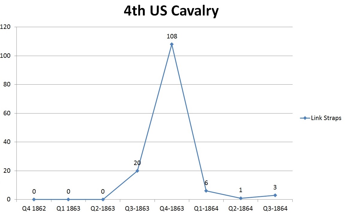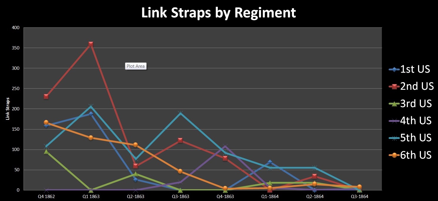 When looking at the raw data each regiment arguably only outfitted 30% of its regiment with link straps. One thing that is interesting to note is that I held an assumption that links became more popular as the war progressed, thus making it more NUG for late war events. However, using the data from the US Regular Cavalry, the opposite actually is true.