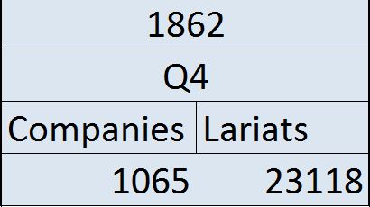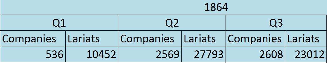 We quickly realized that the lariats were really only good for about a month of actual use. After which it would break easily. The quicker they break, the harder it would be for the QM to keep up with reissuing new ones. My Hypothesis was that the numbers of Lariats would progressively decrease as the war went on. As you can see in the data below, a clear trend appeared once we plugged every single company of cavalry that turned in their quarterly numbers.