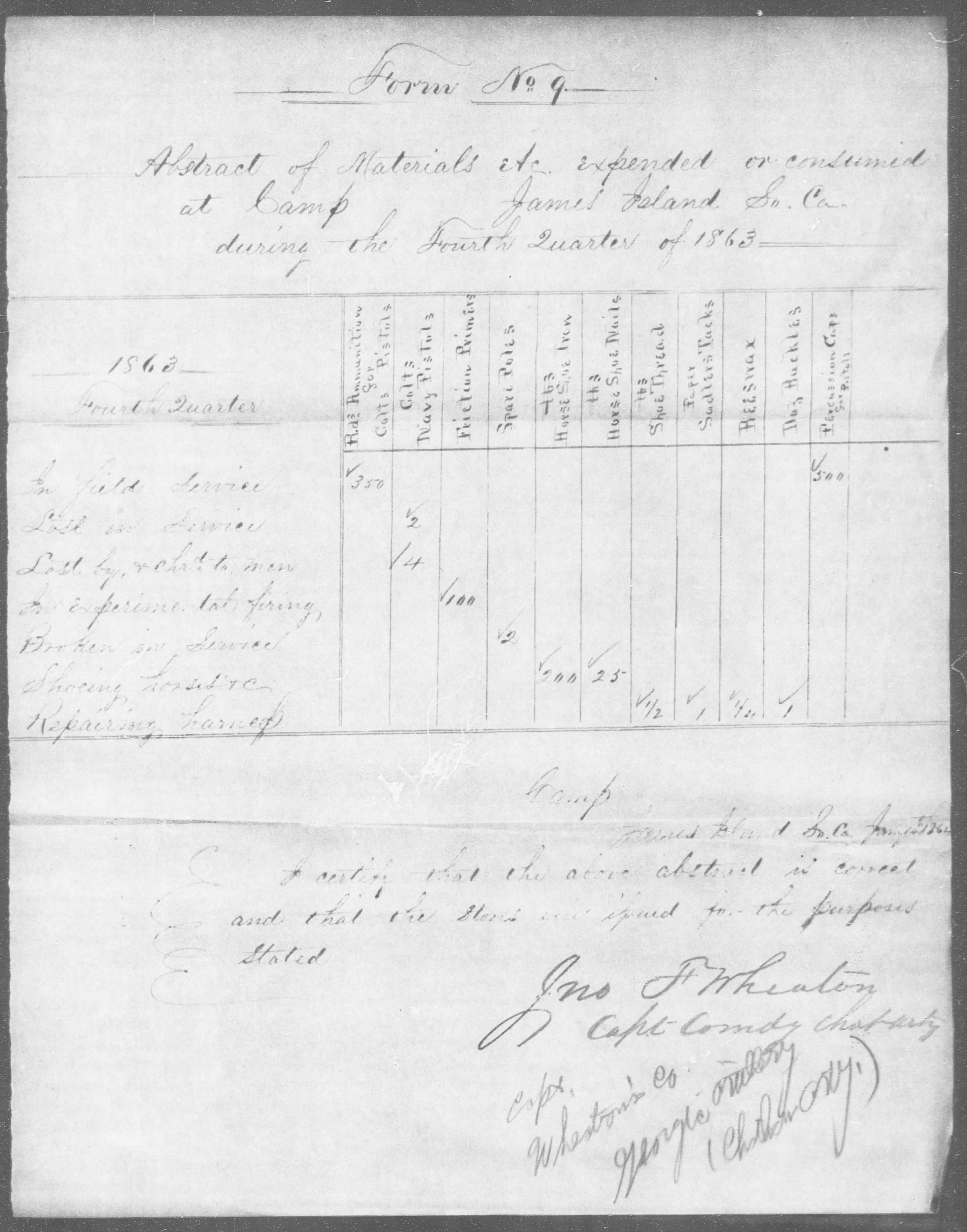 The first two are from the Chatham Artillery and were found in the compiled military service record of Captain John F. Wheaton. One is a Abstract of materials expended in the 4th quarter 1863. It shows 350 rounds ammunition for Colt's pistols expended in field service along with 6 Colt's navy pistols lost in service while at James Island, SC. Note also that only friction primers were used in experimental firing and no artillery ammunition was expended.