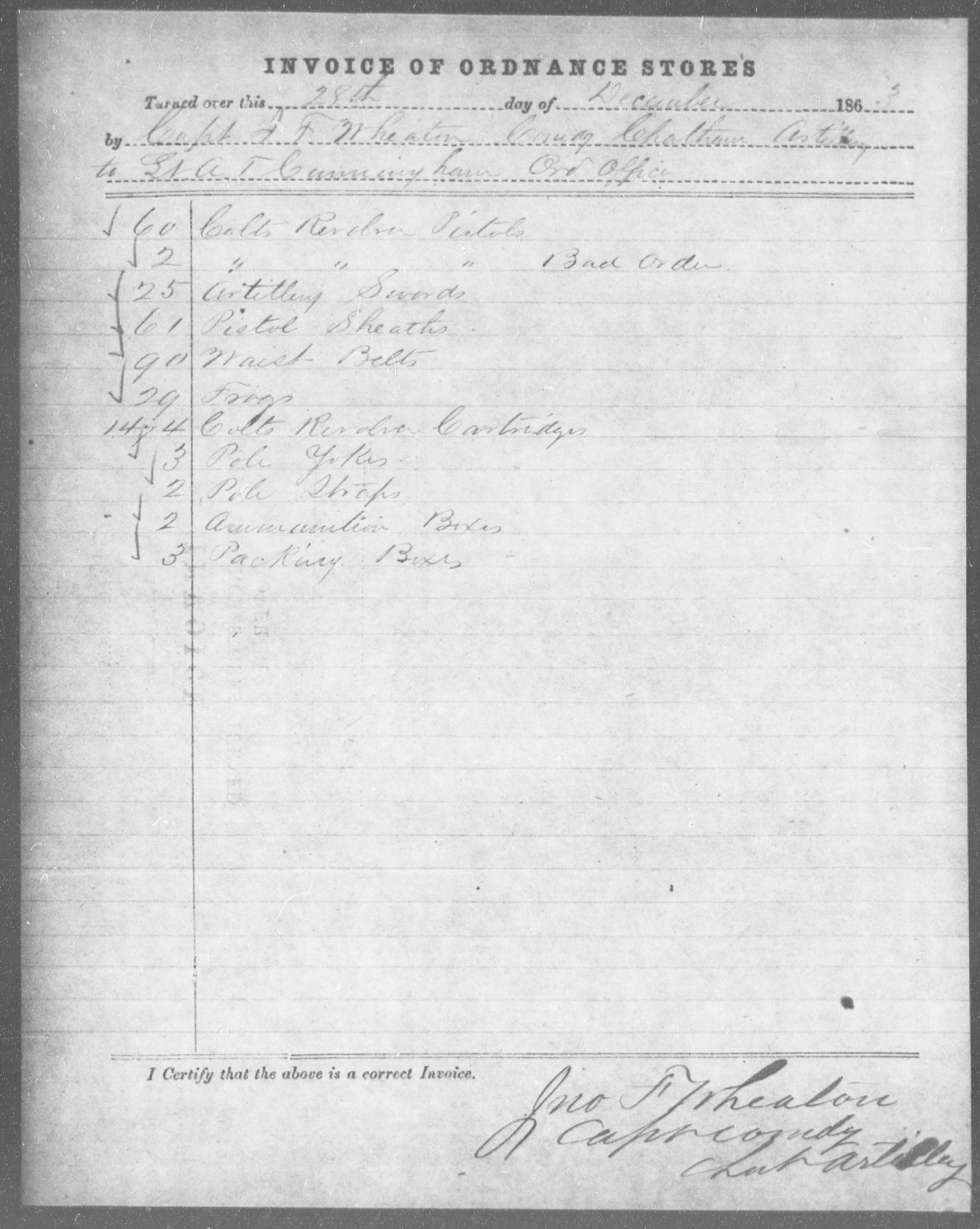 The second from the Chatham Artillery shows an Invoice of Odrnance Stores turned in Lt. A.T. Cunningham, Ordnance Officer at Savannah, GA. In this invoice 62 Colt's Revolver Pistols, along with 61 psitol sheaths, 25 artillery swords, 29 frogs, 90 waist belts, 1464 Colt's revolver cartridges and 2 ammunition boxes were turned over to the ordnance officer.