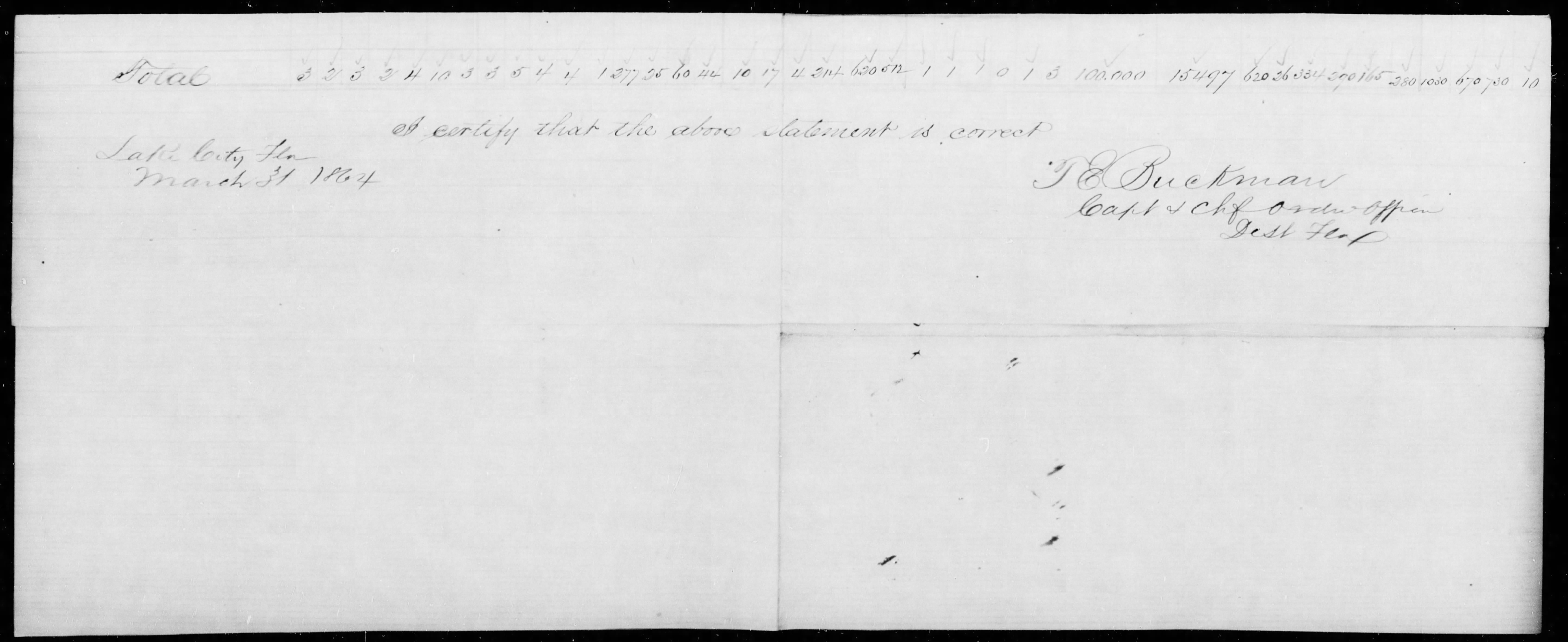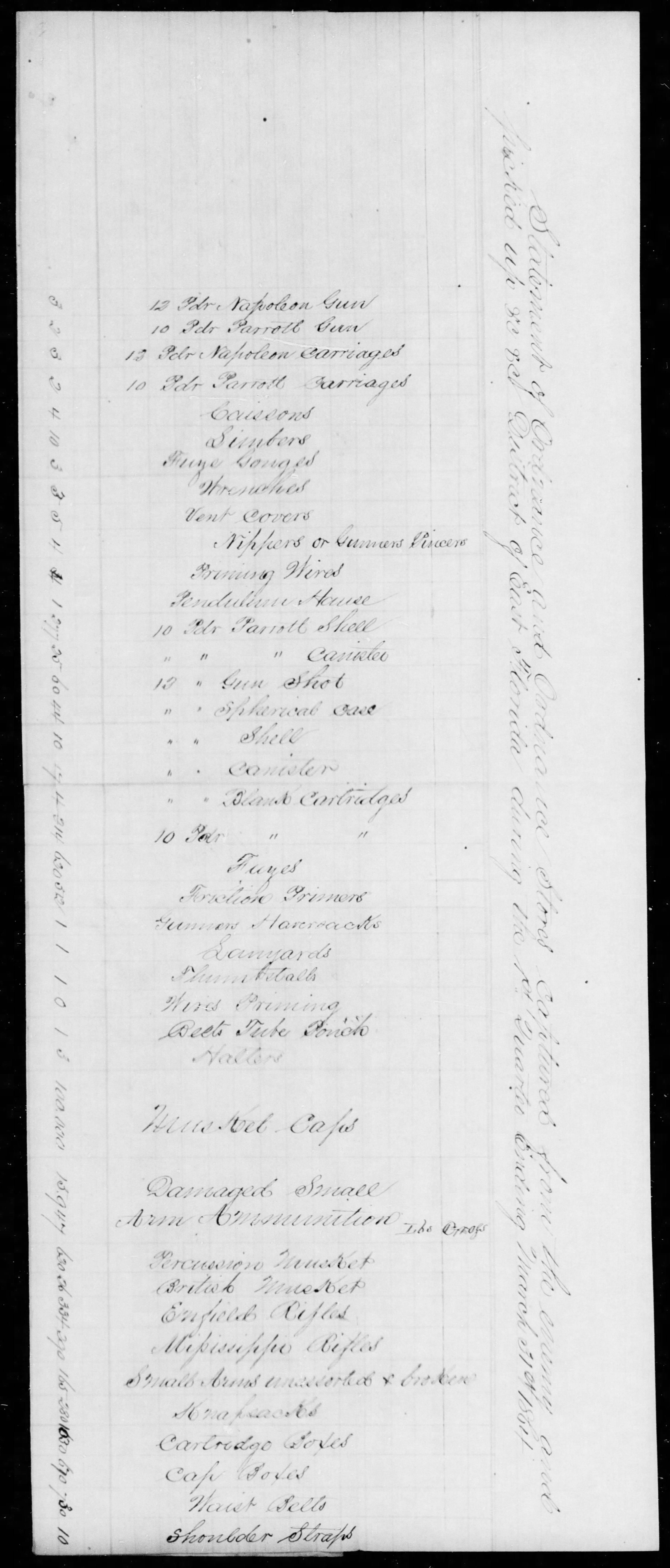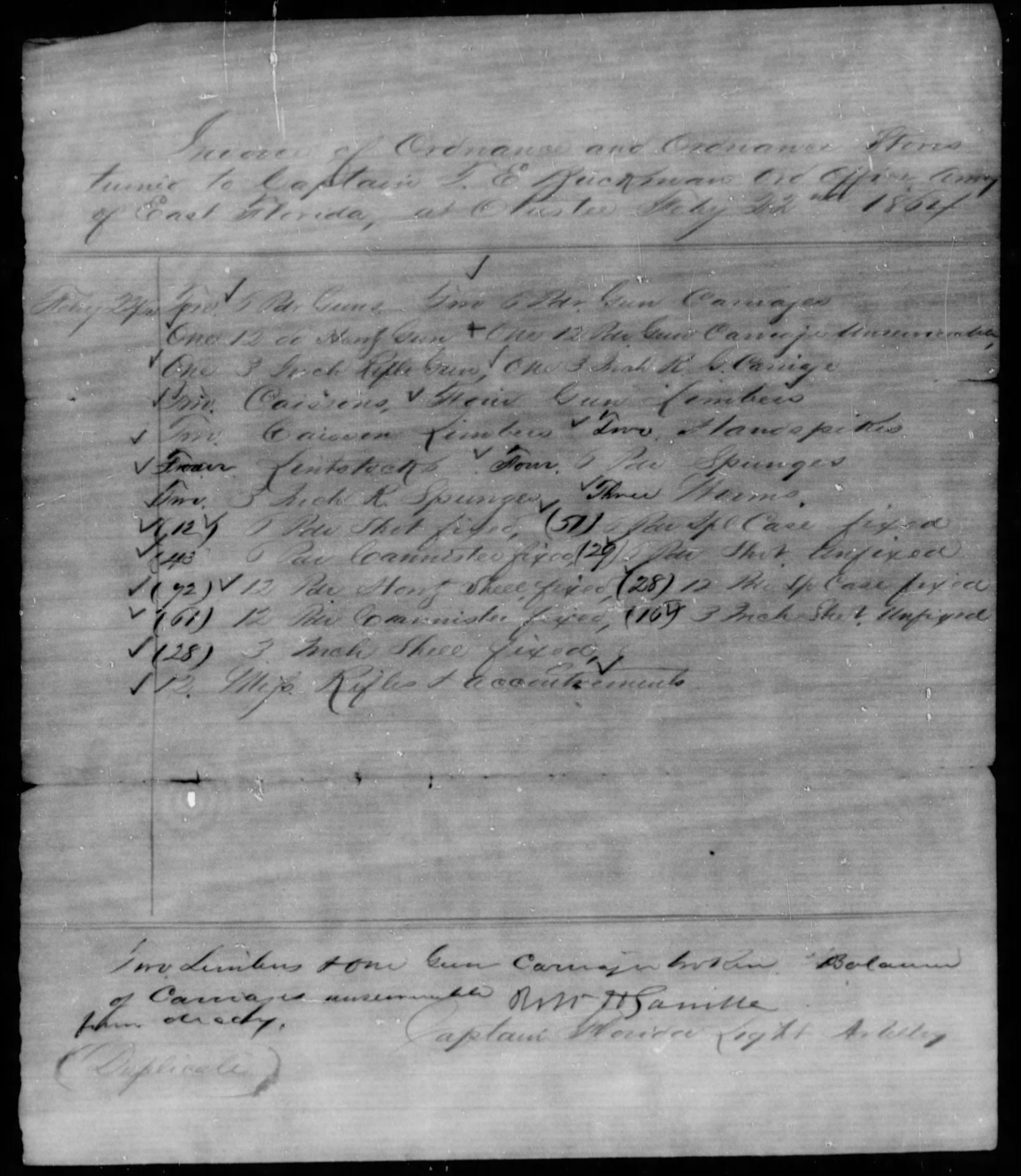 The Florida Light Artillery turned in the 12 Mississippi Rifles 2 days after the Battle of Olustee. Unlike the artillery pieces on the same invoice, no ammunition for the Mississippi Rifles was turned in to the ordnance officer. It should also be noted that Lt Buckman made a separate accounting of Ordnance captured in the 1st Quarter 1864 and the artillery pieces on Gamble's invoice are not listed, clearly making these the guns of the battery ar the battle. There were 370 Mississippi Rifles captured on Buckman's invoice, so these 12 on Gamble's invoice could reasonably be battery property like the cannon as it was not the duty of a battery to collect weapons from a battlefield, but the duty of the Ordnance Officer and those detailed to him.