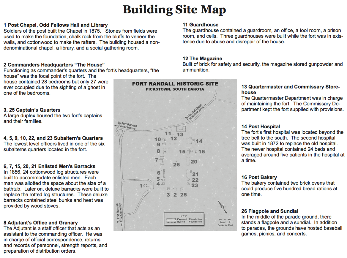 So why aren't there any structures on site now? When the army ended operations at Fort Randall in 1892, the buildings were sold at public auction. The local civilian population swooped in and bought up every window, door and every board-foot of lumber for use on their farms and homes. The only thing they left were the cellar holes.