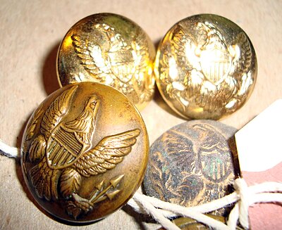 I checked 15 and all had horizontal and vertical lines. Maybe some contractors cut corners back then also and used improper dies. Here are two repro eagle buttons, one with horizontal lines and one with out. Both are at least 5 years old. Also shown are one non-dug and one dug original eagle buttons. Nice detail on the non-dug one. The dug one does have the lines running both ways. Now that I look closer at the repro with no horizontal lines I don't believe it ever had any. Must be a die problem.