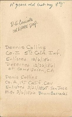 I have in my possession the image of a California soldier named D.E. Collins. According to Records of California Men in the War of the Rebellion 1861 to 1867, he could be one of at least two men. The first is Dennis Collins, who enlisted in the 5th California Infantry, Co. I on December 6, 1861 (he deserted just 20 days later at Camp Union). The second is Denis Collins, who enlisted in Co. A of the 1st California Cavalry on March 21, 1865 at San Jose (he was mustered out on March 6, 1866 at Drum Barracks in Wilmington, CA). This exact information is also written on the back of the CDV in pencil. My personal belief is that he's the latter, particularly because of what he's wearing in the image. It looks very much like something a cavalryman would wear.