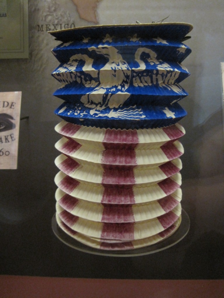 I was unable to find any references to paper lanterns with patriotic symbols or motifs. I looked in Google Books and The Library of Congress. In Google Books, most references to paper lanterns between 1850-1865 had to do with the Orient, Japan or India. I did find several drawings at the LOC.
