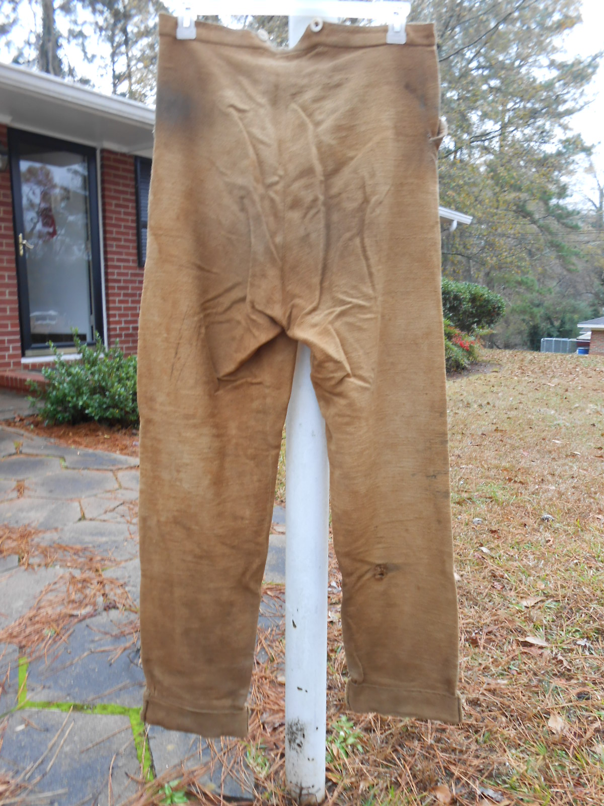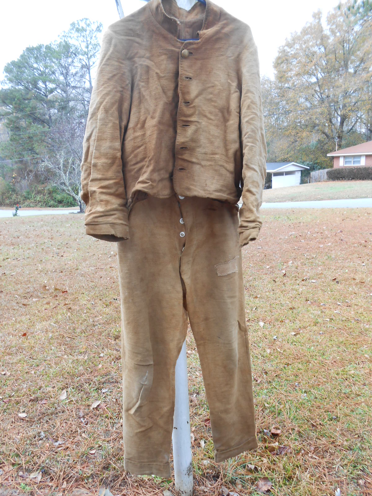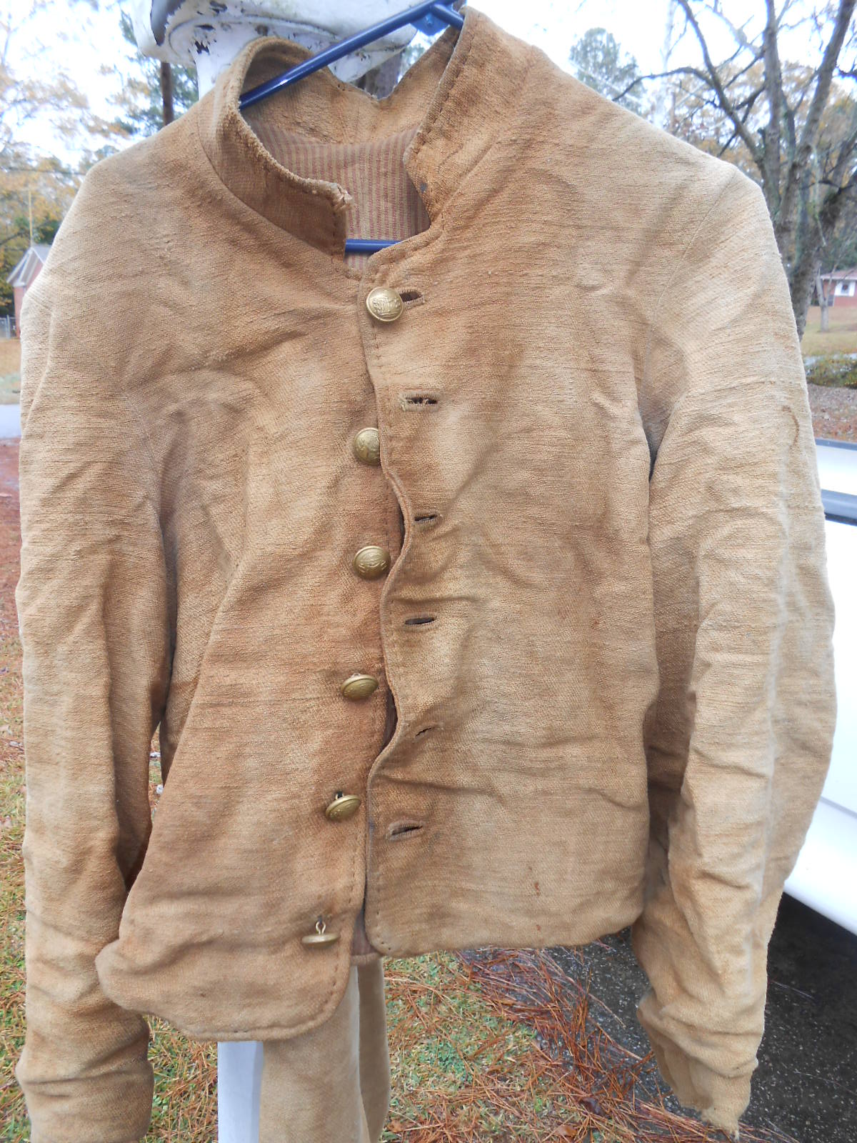 Scott, Here are the pics of my cotton trash uniform, sorry for the delay in the pics on the left trouser leg you will see a patch this cloth was cut from the ankle from the same leg. I had about 4 inches that I had rolled and hand sewn because of the length when I first purchased the uniform, otherwise it is completely hand sewn, bone buttons and dome brass Georgia state seal buttons, normal wear and tear with the exception of 2 (tea dye) bath's. As stated from my last post I retired the uniform after the 1862/2012 campaign and hope to donate to a local museum here in Atlanta that will proudly display it as many times as I had worn it. Enjoy the pics