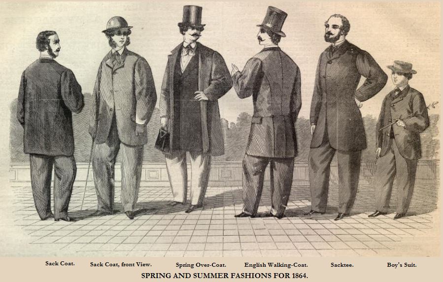 Ok, so I am posting on a 10 year old thread but figured it is better than starting a new one on such a similar topic. I recently ran across a fashion plate in a 1864 Harpers Weekly showing a jacket called a "sacktee". I don't recall ever hearing of that term before so I did some looking around and found it used in other clothing ads from the 1860s along with the usual "sack coat". Here is the fashion plate: