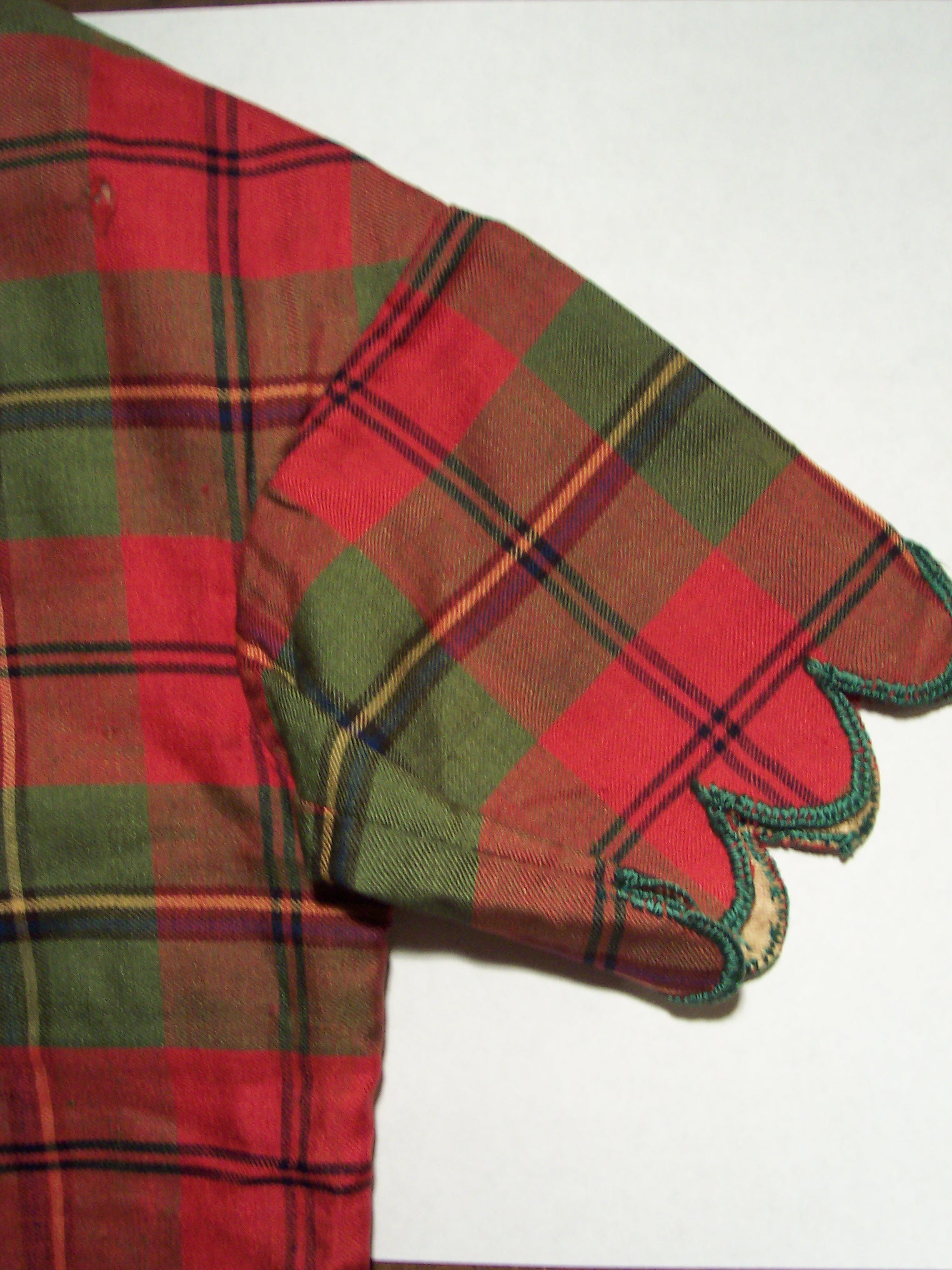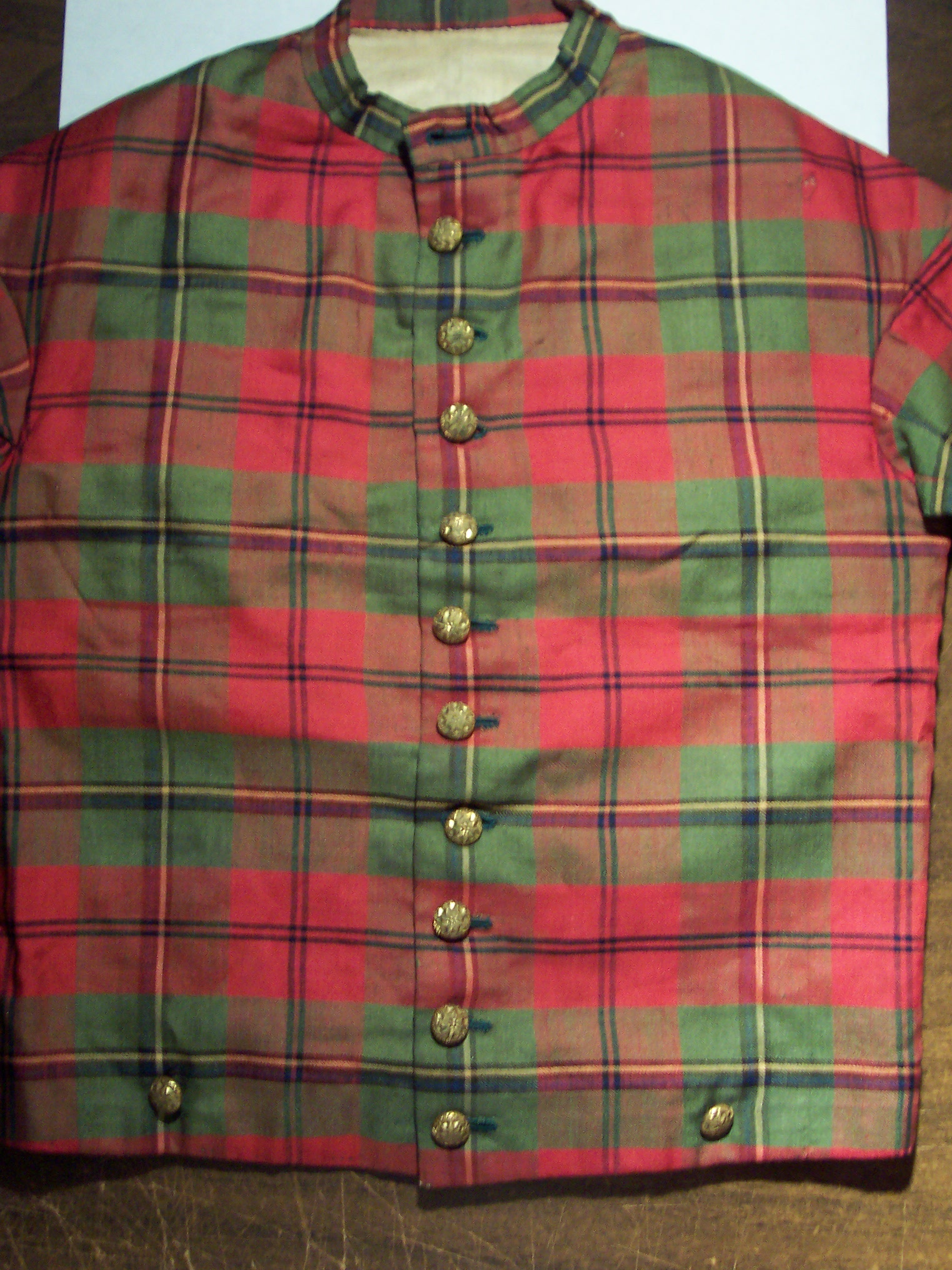 I picked this item up in Ft. Meyers, Fl. this week. It appears to me to be a small child's (male/female?) bodice/blouse made of very finely woven plaid silk. It also exhibits 100% handsewing with polished cotton lining. Nice set of civilian buttons too (16).